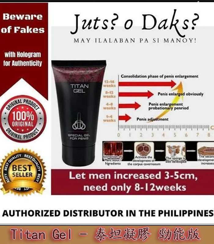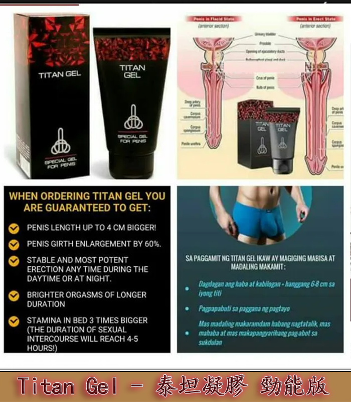 泰坦凝膠(TITAN GEL)是一款針對男性研發的外用保養凝膠,主打增強陰莖血液循環、提升勃起硬度與持久力,並有助於日常私密部位保養與性能力強化。產品採用多種天然植物精華配方,質地清爽不黏膩,作用於陰莖海綿體,從而達到穩步增加血液迴圈並增大其尺寸的效果,而且所取得的效果可以長久保持。這款乳霜已經臨牀測試並獲得醫生和專家使用許可,沒有任何禁忌。